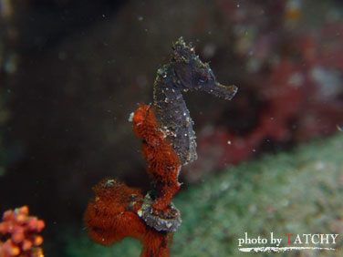 タツノオトシゴの方が馴染み深い名前だと思うのですが、私が見ているほとんどが、ハナタツという種なんだそうです。 前者と後者との見分けは非常に難しいのだそうですが、私でもわかる!簡単な見分け方に後頭部が長ーいのがタツノオトシゴで写真中央のように頭から枝のようなものが出ていたり! 後頭部がそれほど出ていないのはハナタツなんだそうです。 後頭部が出ているって、「メーテル」みたいな感じでしょうか? やっぱりよく分からないかも。 右の写真はダイバー×ハナタツ! ハナタツからしてみると私たちダイバーってどんな風に見えているのでしょうか。